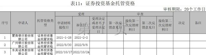 近日,证监会发布了《证券、基金经营机构行政许可申请受理及审核情况公示》。文件显示,目前排队申请证券基金托管资格的机构仅剩3家,分别是蒙商银行、广州银行和东吴证券,这3家机构的申请材料接收日分别为2021年1月28日、2022年8月30日、2022年10月17日。