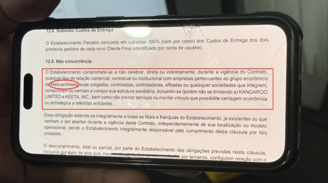 上图为99Food排他性条款,红框内容译文为:商家承诺,在本合同有效期内,不得直接或间接与美团/Keeta商业集团所属的任何企业签订商业、合同或制度性协议,包括其关联公司受控公司、控股公司、附属公司或任何构成其公司架构的实体(包括但不限于KANGAROO LIMITED和KEETA,INC.),且不得提供服务或保持任何可能为上述实体带来经济或战略利益的联系。