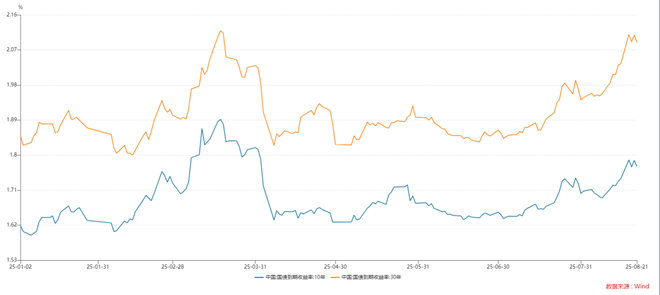 Wind数据显示,10年期和30年期国债到期收益率自8月8日以来一路震荡上行,其中,30年期国债到期收益率从低点1.95%附近一路上行,最高突破2.1%;10年期国债到期收益率从低点1.68%附近一路上行逼近1.79%。