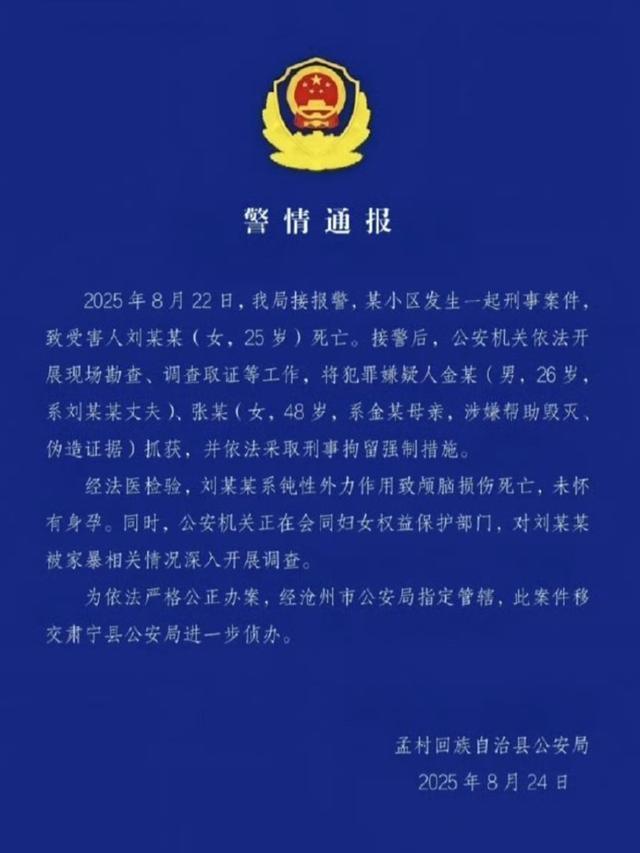 8月24日晚,河北沧州孟村县公安局发布警情通报:2025年8月22日,我局接报警,某小区发生一起刑事案件,致受害人刘某某(女,25岁)死亡。接警后,公安机关依法开展现场勘查、调查取证等工作,将犯罪嫌疑人金某(男,26岁,系刘某某丈夫)、张某(女,48岁,系金某母亲,涉嫌帮助毁灭、伪造证据)抓获,并依法采取刑事拘留强制措施。