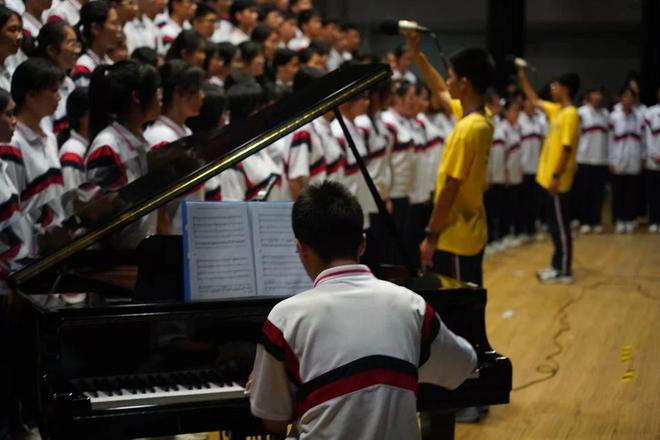 2023年10月,高中校运颁奖晚会的彩排,Kelvin在做钢伴。(图/受访者供图)