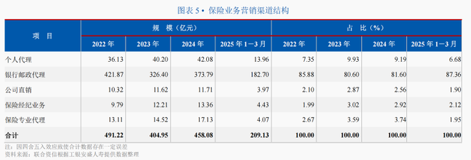 除工银安盛人寿外,中邮人寿2022年~2024年银保渠道的保费收入占比达到96%以上,建信人寿2022年~2025年一季度银保渠道的保费收入占比达到85%以上。