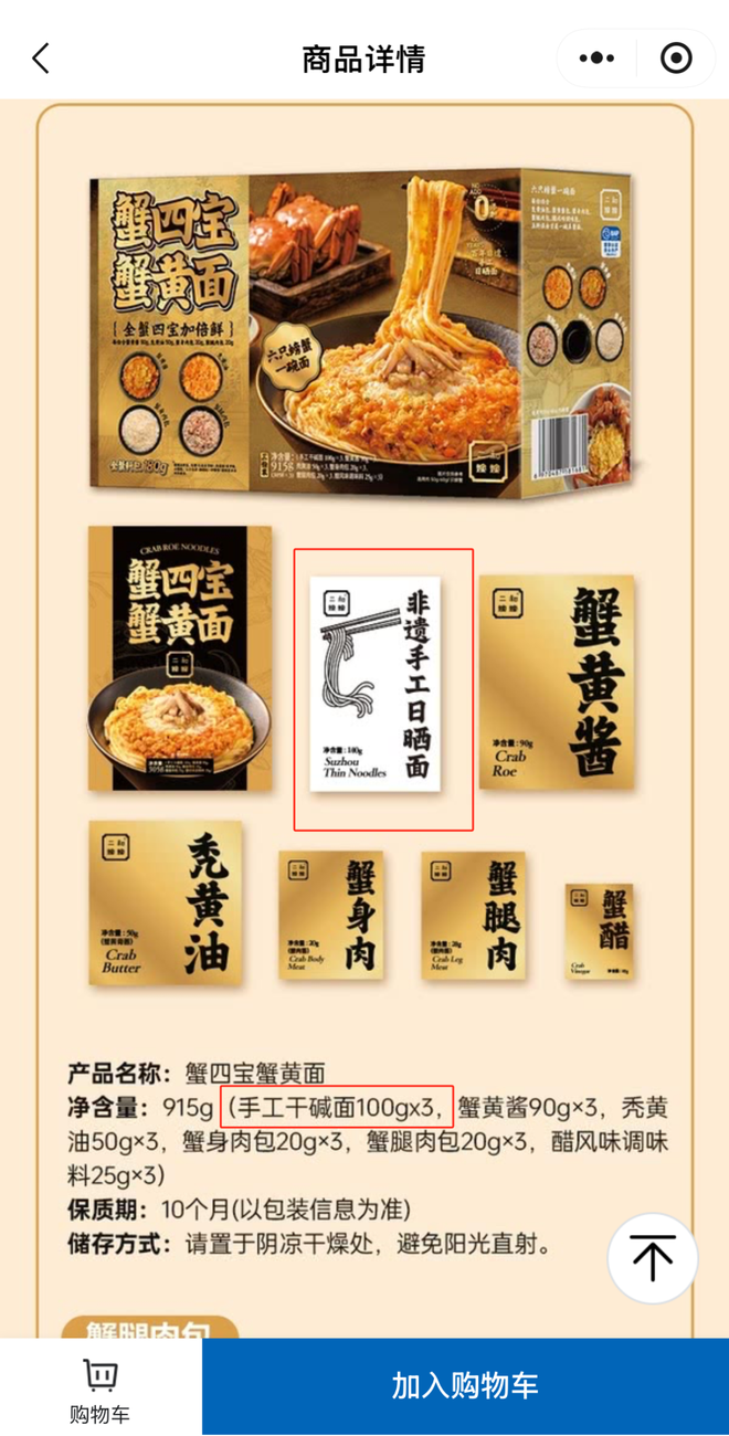 记者查询山姆小程序发现,这款“蟹四宝蟹黄面”915g规格,售价118.9元。商品详情同样存在信息矛盾:产品外部封面印有“非遗手工日晒面”字样,下方净含量却标注“手工干碱面100g*3”,进一步印证了包装标签的混乱性。