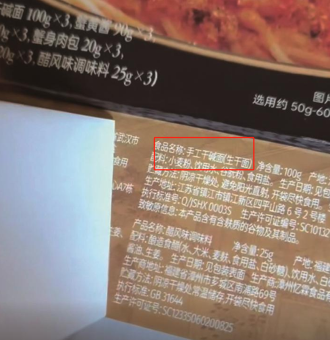 潘先生称,仔细看配料表后发现,最外层纸壳包装上的配料表是后来贴的贴纸,而原标签食品名称正是“手工干碱面(生干面)”。