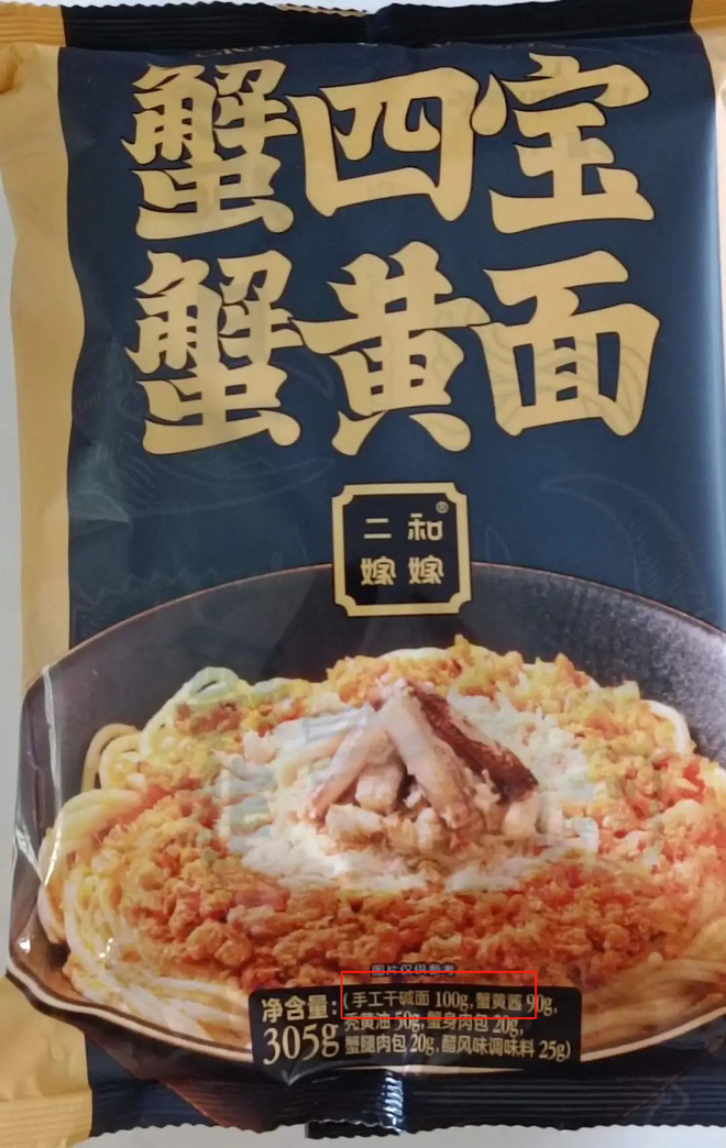 对此,记者致电“蟹四宝蟹黄面”的供应商(代工厂)江苏华秀食品有限公司询问,公司负责人回应,“蟹四宝蟹黄面”包装内的食品名称为“手工干碱面”,其采用传统工艺,配料表中有小麦粉、饮用水、谷朊粉和食用盐,由于小麦粉和谷朊粉含有矿物质较多并呈碱性,属于“原料带入碱性物质”,故称手工干碱面,符合《GB 7718-2011食品安全国家标准预包装食品标签通则》4.1.2食品名称的相关要求。负责人以“弱碱性矿泉水”举例:配料表只有水,没有添加食用碱,但检测出来是呈弱碱性,产品名称仍可叫作弱碱性矿泉水。