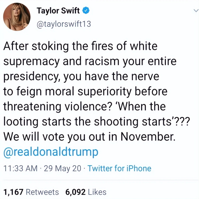 2020年5月29日,泰勒·斯威夫特在推特上公开批评特朗普。(图/社交媒体截图)