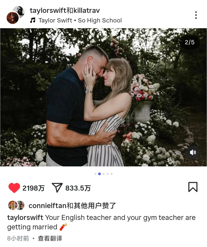 当地时间8月26日,流行歌手泰勒·斯威夫特(Taylor Swift)在社交媒体上发布和橄榄球球员男友特拉维斯·凯尔斯(Travis Kelce)的甜蜜合照,并配文:“你的英语老师和体育老师要结婚了。”