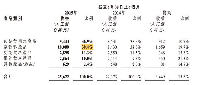 今年上半年该板块实现营收100.89亿元,同比增长19.7%,营收占比由去年同期的38%提升至39.4%。但需要注意的是,与2023年和2024年同期59%以上的增速相比,今年茶饮料板块增速显著放缓。