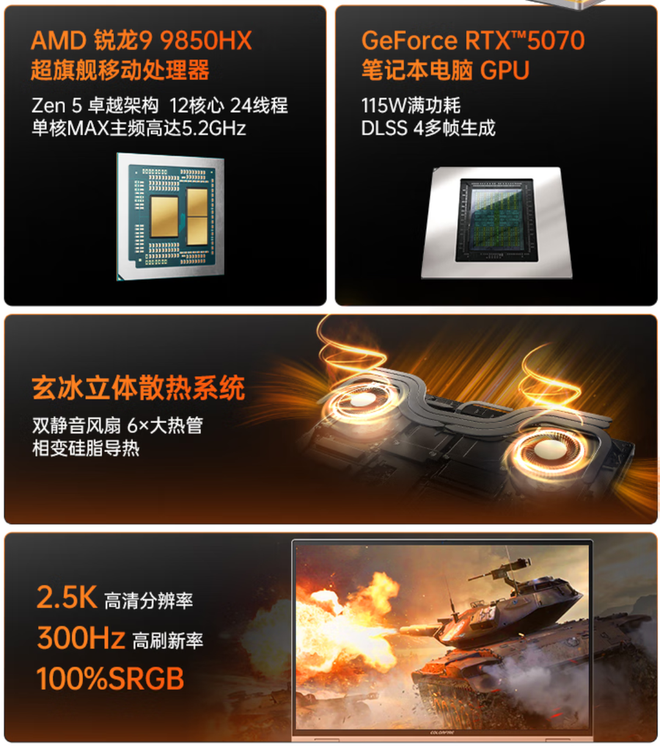 硬件方面,这款游戏本采用基于Zen 5架构的AMD锐龙9 9850HX处理器,采用Zen 5架构的12核24线程设计,其主频最高可达5.2GHz。可选英伟达RTX 5060/5070显卡,功耗均为115W,均内置8GB GDDR7显存,支持DLSS4多帧生成技术。配有1TB PCIe 4.0固态硬盘,内置双M.2插槽,支持玩家自行扩展,配有16GBx2 5600MHz DDR5双通道内存。散热方面搭载双静音风扇,配有6X大尺寸热管+超薄合金鳍片,辅以相变硅脂导热。