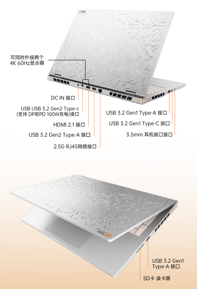 其他方面,橘宝R16 Ultra配备80Wh大电池,标配240W氮化镓轻量电源适配器。连接方面支持WIFI 6E无线连接,接口方面配备了两个USB 3.2 Gen1 Type-A接口,一个USB 3.2 Gen12 Type-A接口,一个USB 3.2 Gen1 Type-C接口,一个USB 3.2 Gen2 Type-C全功能接口(DP输出/100W充电),一个HDMI 2.1接口,一个2.5G RJ45网口,一个SD读卡器和3.5mm音频接口。