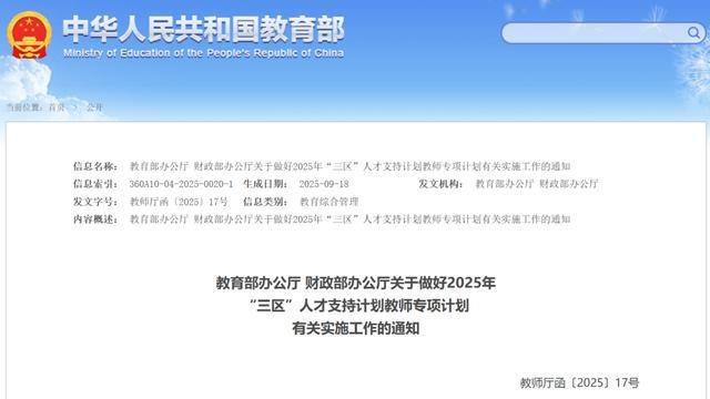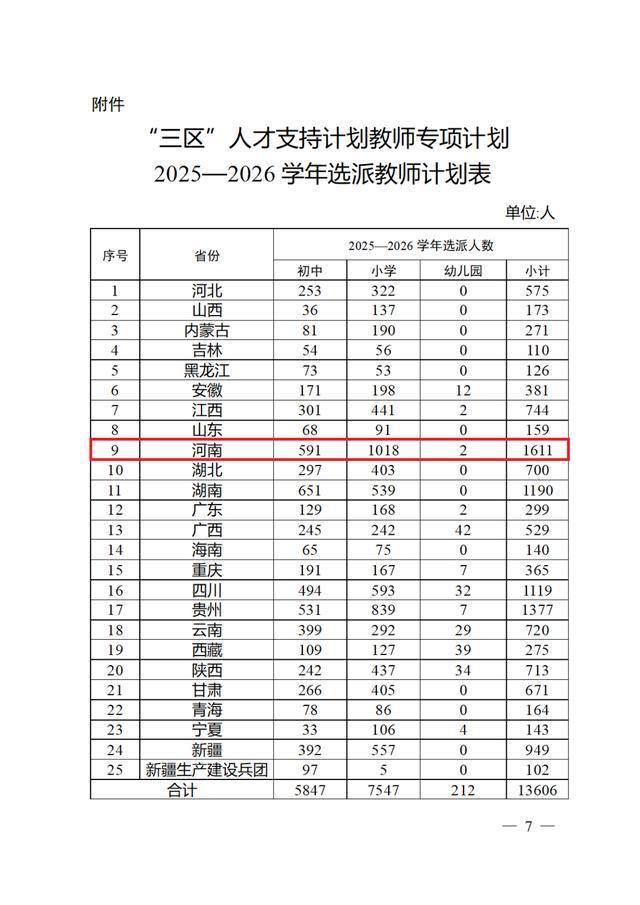 近日,教育部、财政部近日联合印发《关于做好2025年“三区”人才支持计划教师专项计划有关实施工作的通知》(以下简称《通知》)。按照通知,2025—2026学年度全国计划选派13606名教师到“三区”(边远贫困地区、边疆民族地区和革命老区)支教,其中河南计划选派1611名教师(初中591名、小学1018名、幼儿园2名)。