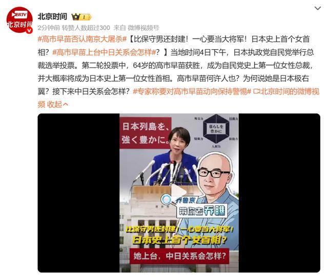 当地时间4日下午,日本执政党自民党举行总裁选举投票。第二轮投票中,64岁的高市早苗获胜,成为自民党史上第一位女性总裁,并大概率将成为日本史上第一位女性首相。高市早苗何许人也?为何说她是日本极右翼?接下来中日关系会怎样?专家称要对高市早苗动向保持警惕。
