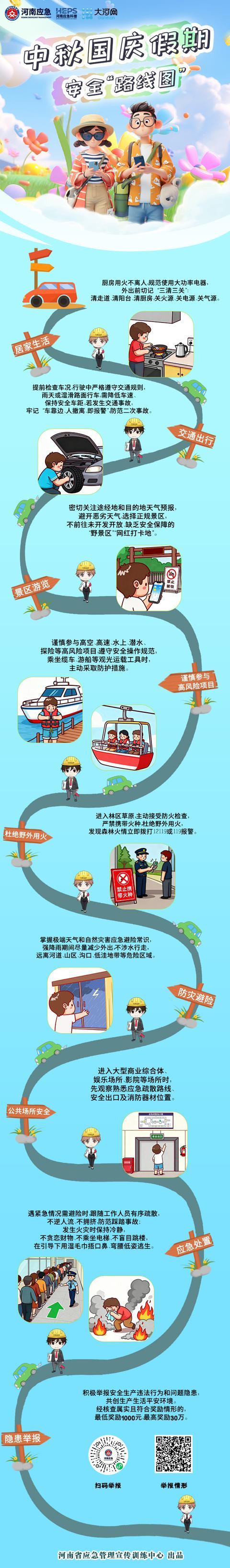 中秋国庆8天长假已经过半,小伙伴都去哪里玩了?不过,玩得尽兴的前提是要把安全放在第一位!不论是休闲聚会还是出门旅游,从交通出行到景区游玩,这些安全事项都不能忽视。假期安全“路线图”请查收: