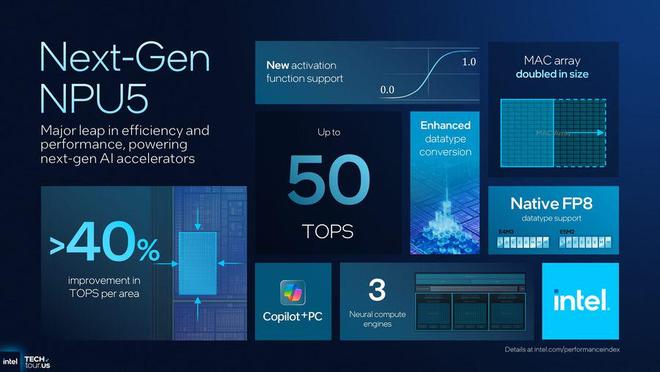 在性能表现上,Panther Lake的CPU部分呈现出稳健提升的态势,单核性能较Lunar Lake提升约10%,多核性能在相同功耗下提升可达50%。真正的突破在于图形性能,12Xe版本的核显不仅性能大幅跃升,还支持XeSS 3.0和帧生成技术,为移动游戏体验带来了新的可能。AI方面,NPU5虽然算力维持在50 TOPS以符合Copilot+ PC认证标准,但通过架构优化实现了超过40%的面积效率提升,在成本与性能间取得了更好的平衡。