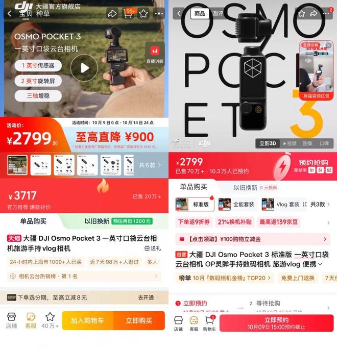 记者查询大疆天猫官方旗舰店看到,确实有多款产品降价。其中,大疆明星产品之一的Osmo Pocket 3至高直降900元;Osmo Mobile SE手持云台直降300元;Mic Mini迷你无线降噪夹领麦克风至高直降410;Mini 4 PRO航拍无人机至高直降1478元。天猫店铺还显示,大疆“双十一”活动从10月9日开始,以上优惠的期限为10月9日0时—10月14日24时。