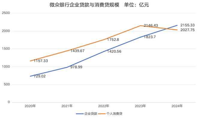 回看微众银行去年的贷款规模,增长主要来自于企业贷款的推动,全年增长18.18%。而其消费贷余额为2027.75亿元,首次出现下滑,下滑幅度5.53%。
