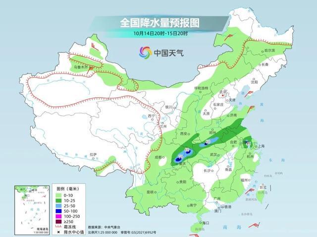 后天晚上至15日白天,四川东北部、重庆中北部至山东南部、江苏北部等地仍然会有中到大雨、局地暴雨现身。