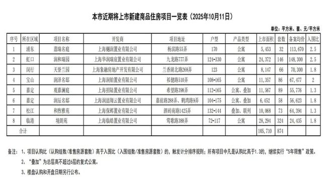 10月11日,上海网上房地产官网披露本市近期将上市新建商品住房项目一览表。本次共推出6个区的8个项目,合计874套房源,总建面10.57万平方米。此次入市的项目均为加推批次,暂无全新盘亮相。