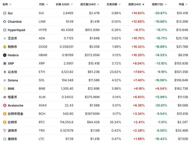 10月12日晚上和10月13日早间,加密货币市场迎来大反攻,比特币升至11.5万美元以上,大涨近4%;以太坊、SOL、XRP、狗狗币都大涨10%,币安币大涨12%。截至10月13日19时15分,加密货币市场维持上涨态势,比特币24小时涨幅2.41%,以太坊24小时涨幅7.94%,艾达币、狗狗币24小时涨幅均超10%。