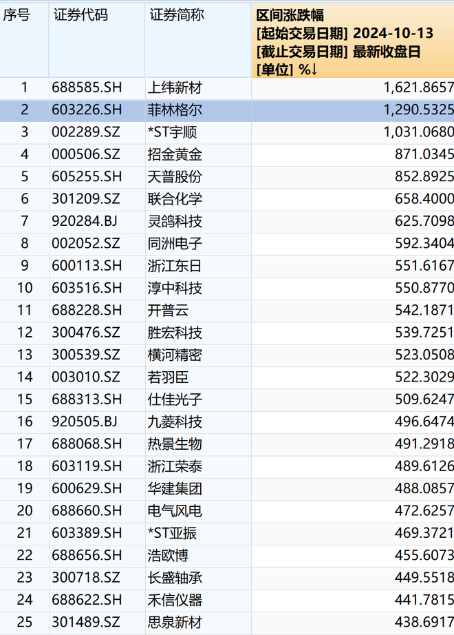 10月13日,家具制造商菲林格尔(603226.SH)低开后大幅拉升,收涨9.15%,报47元/股。至此,菲林格尔股价已较2024年9月18日的2.88元/股的低点上涨了1531.94%,近一年涨幅也高达1290.53%,涨幅位列A股市场第二,仅次于上纬新材(688585.SH)。