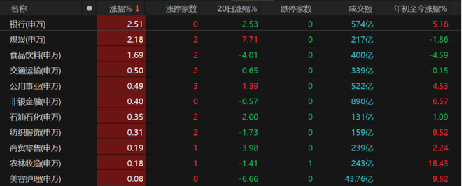 传统股护盘,银行、煤炭板块涨幅均超过2%,低迷许久的食品饮料板块也表现不错,交通运输、公用事业、非银金融等板块微涨。个股来看,宝泰隆、大有能源涨停,会稽山、远大控股、南京港、国新能源、佛燃能源、长春燃气也涨停。