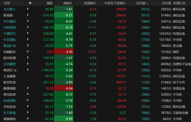 市场亏钱效应明显,共计1734只个股收涨,涨停股45只;3554只个股收跌,跌停股8只。今日A股市场中共有19只个股的日成交额突破100亿元大关,主要集中在有色金属、半导体、通信设备等热门板块,但多数个股当日收盘下跌。北方稀土一度涨近7%,最终收跌1.61%报56.8元/股,日成交额为251亿元;新易盛跌逾9%,中际旭创跌逾8%;中芯国际跌近7%,立讯精密跌近5%。