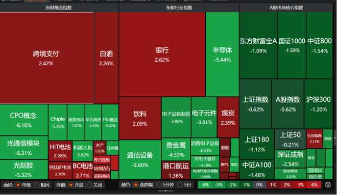 在银行等传统股护盘下,沪指收跌0.62%,创业板指跌近4%,深证成指收跌2.54%,科创50跌逾4%。