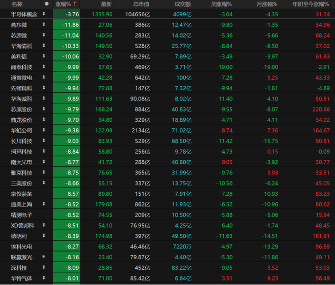 半导体概念跌近4%,燕东微、芯源微跌幅均超过11%,闻泰科技跌停,华虹公司、长川科技、鼎龙股份、芯原股份跌幅均超过9%。