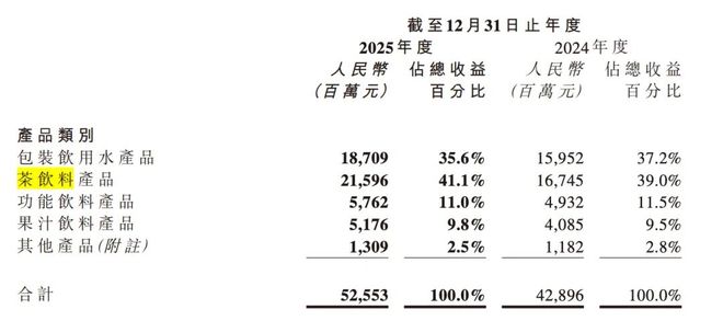 农夫山泉以卖水起家,但从2024年开始,茶饮料已超越饮用水成为内部第一大业务板块,这一趋势还在继续。2025年公司茶饮料业务营收215.96亿元,同比增长29%,占总营收的41.1%,大单品东方树叶功不可没。