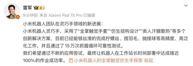 雷军介绍小米机器人团队在灵巧手领域的新进展