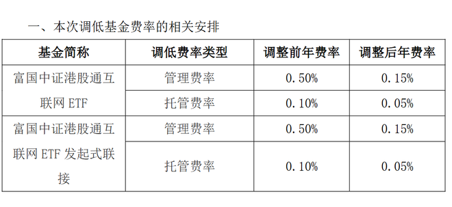 根据富国基金公告,港股通互联网ETF富国及其联接基金将管理费率从0.5%调低至0.15%,同时将托管费率从0.1%调低至0.05%。调整后的管理费率和托管费率均是目前全市场ETF中的最低一档。