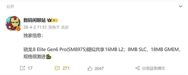 据数码博主爆料,骁龙8E6 Pro的核心升级亮点集中在缓存规格的大幅提升。该芯片将配备16MB共享L2缓存与8MB SLC缓存,相较于上一代骁龙8E5所采用的12MB L2缓存,升级幅度显著,也成为高通历史上缓存规格最大的手机芯片。