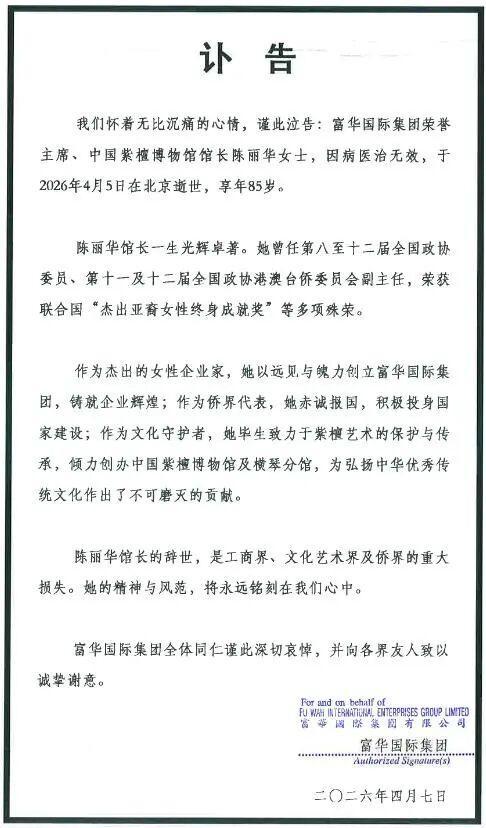 4月7日,富华国际集团发布讣告:富华国际集团荣誉主席、中国紫檀博物馆馆长陈丽华女士,因病医治无效,于2026年4月5日在北京逝世,享年85岁。目前,富华国际集团官网页面已变黑白。