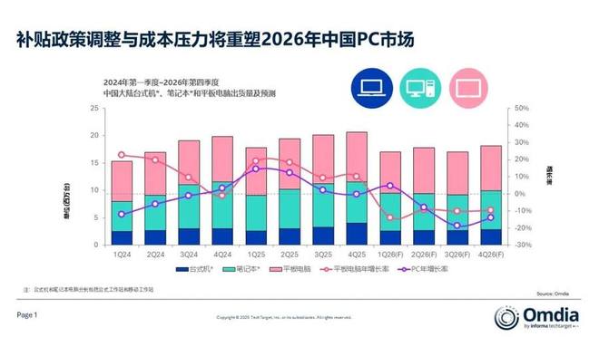 Omdia表示:“2025年,推动PC需求增长的补贴政策在 2026 年已开始调整。整体补贴力度已从去年的约30%收窄至约15%。此外,更严格的执行方式,例如省级配额以及分阶段发放补贴,也将限制需求在单一季度内集中释放。与此同时,2025年大规模补贴已经提前透支了部分需求,在零部件成本上升以及整体材料成本通胀的背景下,2026年要实现持续增长将更加困难。多重因素叠加,将使2026年成为中国PC市场及其整个生态体系都面临挑战的一年。”