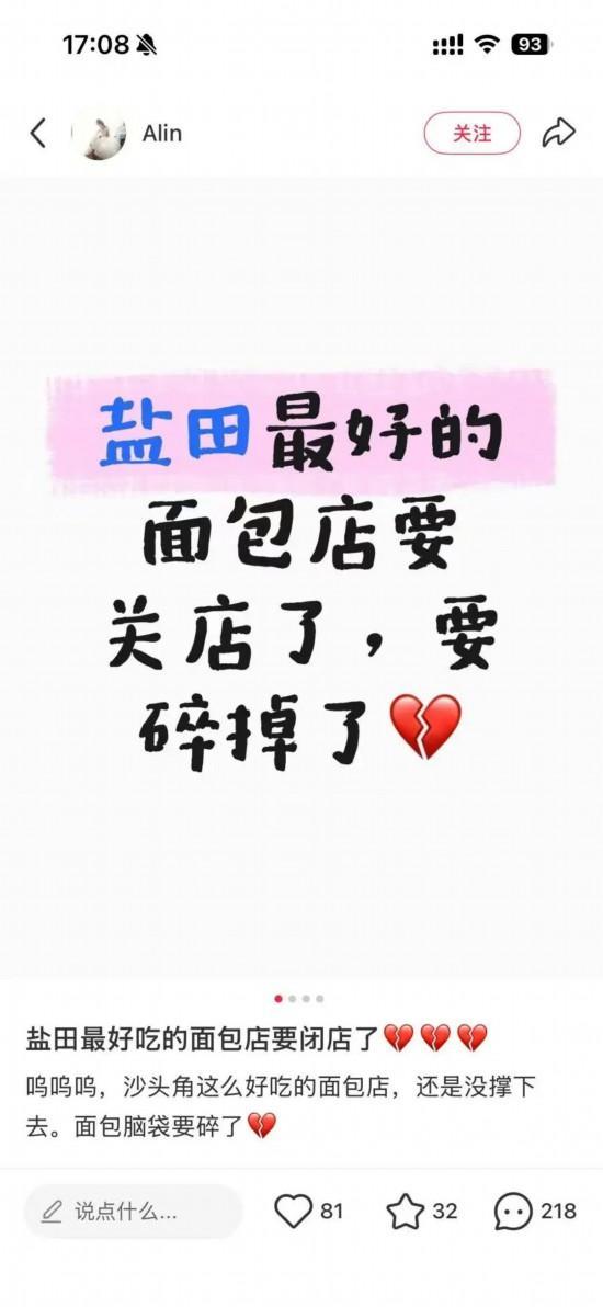 不舍之下,廖女士在社交平台上写了一条帖子,标题写着:盐田最好的面包店要关店了,试图为小店争取一线生机。帖子在本地群里炸开了,涌入大量不舍的留言以及好奇网友的询问。