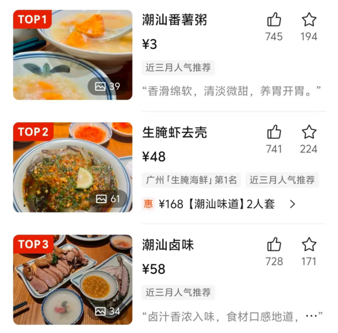 某家潮来运转大排档门店的网友推荐菜界面。(图/点评平台截图)