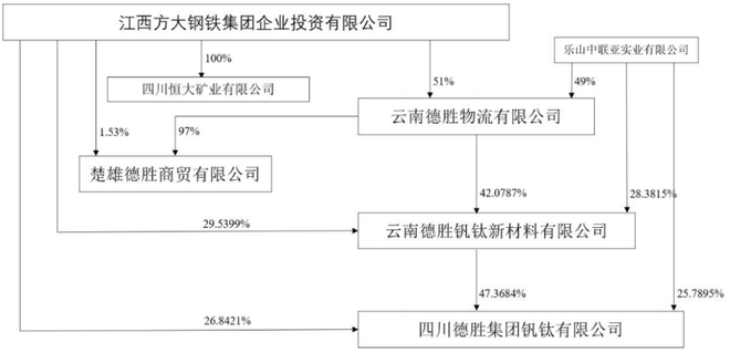 此次交易中,钢铁企投合计出资24.5亿元,收购宋德安持有的云南德胜钒钛新材料有限公司(下称“云南德胜钒钛”)29.54%股权、四川德胜集团钒钛有限公司(下称“四川德胜钒钛”)26.84%股权及楚雄德胜商贸1.53%股权,戴玲英持有的云南德胜物流51%股权及四川恒大矿业98%股权,以及童秀云持有的四川恒大矿业2%股权。