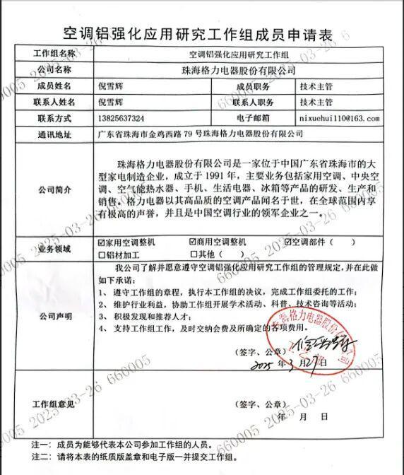 当日晚间,杨祥玺转发朱磊微博表示“又当又立”,并附上了一张《空调铝强化应用研究工作组成员申请表》的扫描件,该申请表的公司一栏为格力电器,签字时间显示为2025年3月27日。