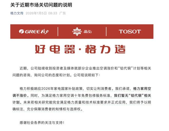 此外,其他主流空调厂商虽然签署了相关自律公约,但仍处于技术研究阶段,并未进入应用阶段,空调产品的核心热交换部件(如冷凝器、蒸发器)仍全面采用纯铜管配置。记者注意到,杨祥玺近日在社交平台上发布了一段视频,再谈“铝代铜”争议,他表示:“所有的主流品牌都是铜的,没有使用铝代铜。”