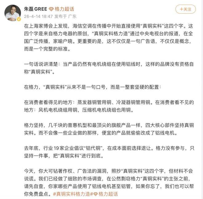 4月14日晚间,格力电器市场总监朱磊在社交平台发文,指控海信空调使用格力原创的“真铜实料”四个字进行宣传,并强调当产品仍有电机绕组使用铝线时,这样的品牌没有资格自称“真铜实料”。