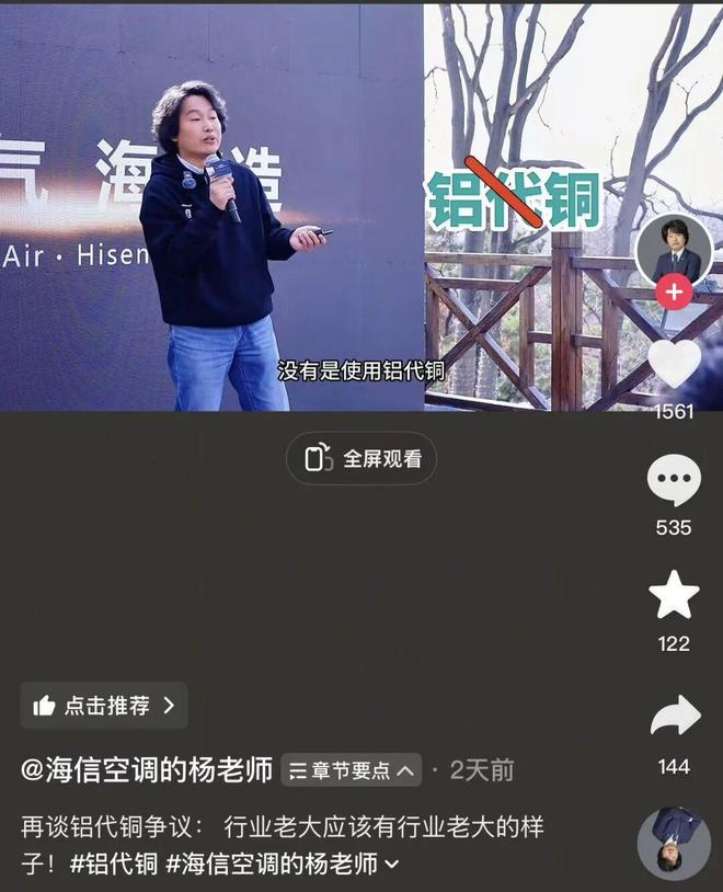 朱磊更是直言,当产品仍然有电机绕组在使用铝线时,这样的品牌没有资格自称“真铜实料”。与此同时,其直指海信“钻著作权、广告法的漏洞”,并放话称,已经做了细致的市场调查,请对方自查,“你家哪些产品使用了铝线电机甚至铝管,如果你忘了,我们也可以帮你免费盘点”。