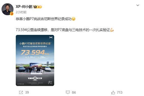 4月27日,何小鹏发文:恭喜小鹏P7挑战吉尼斯世界纪录成功。73.594公里连续漂移,是对P7底盘与三电技术的一次扎实验证。