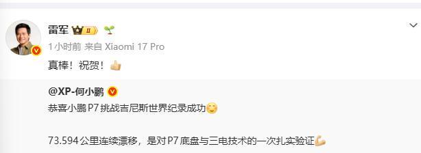 何小鹏发文:恭喜小鹏P7挑战吉尼斯世界纪录成功;雷军转发表示祝贺