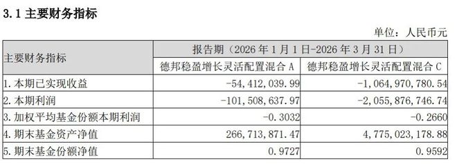 4月21日,德邦基金披露旗下德邦稳盈增长一季报。主要财务数据显示,德邦稳盈增长一季度收益和利润均为负。A类份额一季度实现收益-0.54亿元,实现利润-1.02亿元;C类份额一季度实现收益-10.65亿元,实现利润-20.56亿元,A类份额和C类份额合计在一季度亏损约21.58亿元。